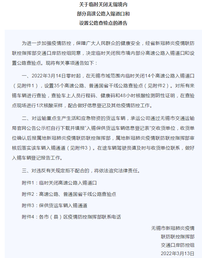 根據(jù)新冠疫情防控需要,結(jié)合高速公路通行實(shí)際情況,經(jīng)研究決定: 自2022年3月12日0時(shí)起,對(duì)南通市境內(nèi)部分高速公路收費(fèi)站出入口實(shí)行臨時(shí)封閉。請(qǐng)廣大駕乘人員提前做好出行規(guī)劃,合理安排出行線路,服從現(xiàn)場(chǎng)指揮,實(shí)現(xiàn)有序通行。