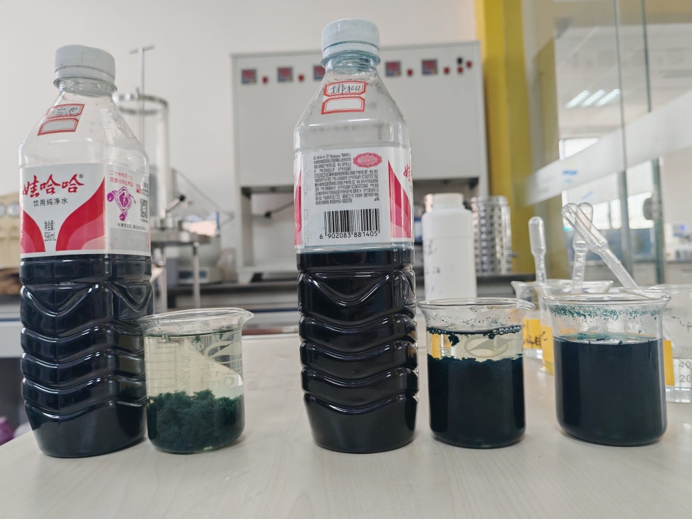一、客戶寄來印染廢水水樣:顏色很深且水質渾濁