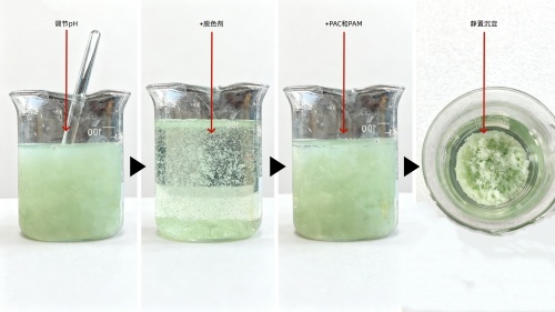根據(jù)污水濃度和出水要求,加入田鑫脫色劑,充分?jǐn)嚢瑁?/p>