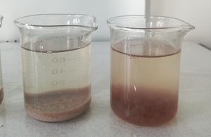 礬花沉降對(duì)比:左一為客戶寄來藥劑沉降效果 (礬花小且沉降不干凈、水渾濁) 右一為我司脫色劑礬花沉降(礬花大且沉降干凈、水質(zhì)清澈)